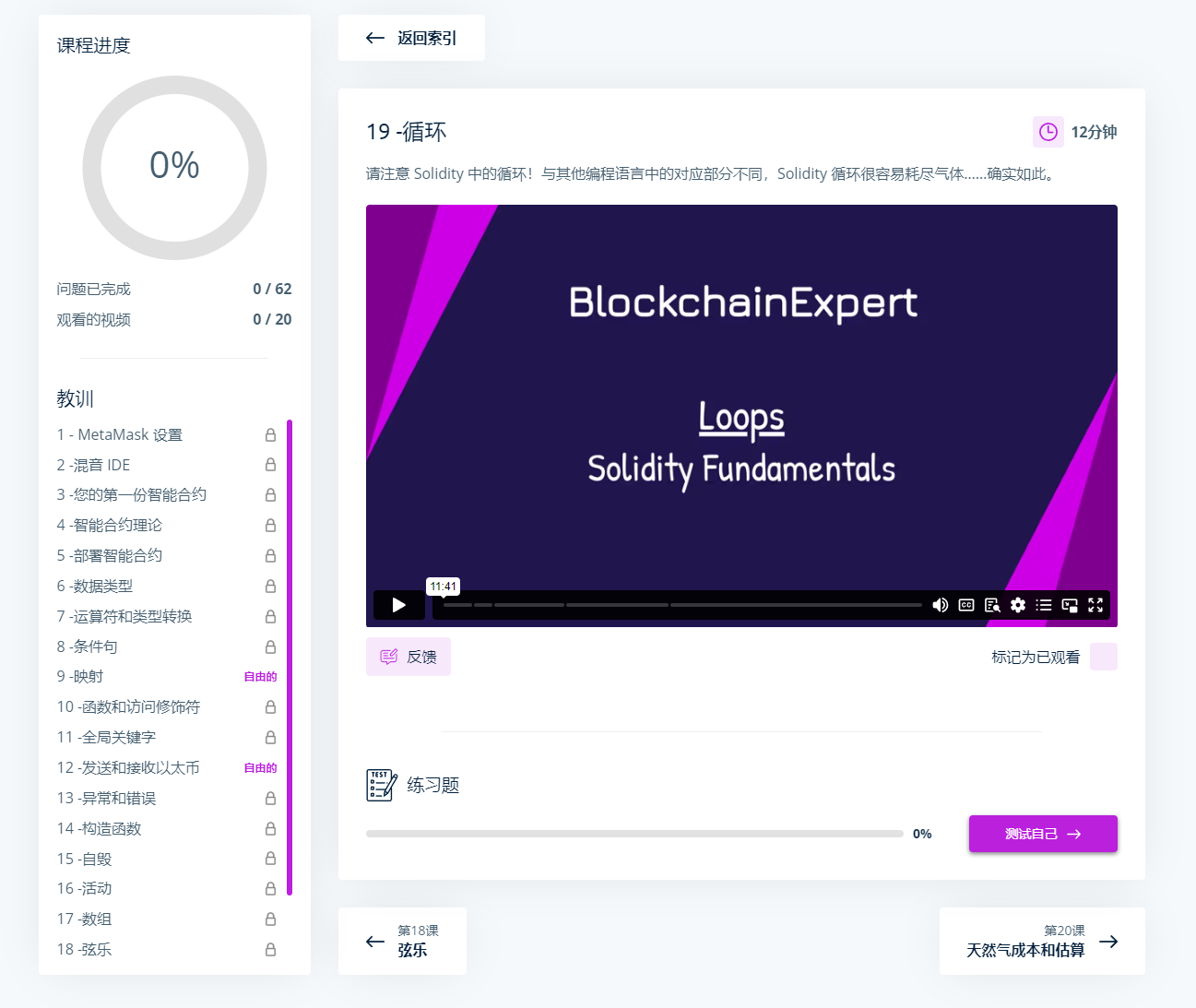 Solidity Fundamentals,AlgoExpert Academy 出版的 Solidity Fundamentals 培训课程。如果不了解 Solidity,学习区块链开发就不算完整,Solidity 是一种流行的面向对象编程语言,用于在以太坊和其他区块链上运行智能合约。本课程教授成为区块链开发人员所需的基本编程概念。