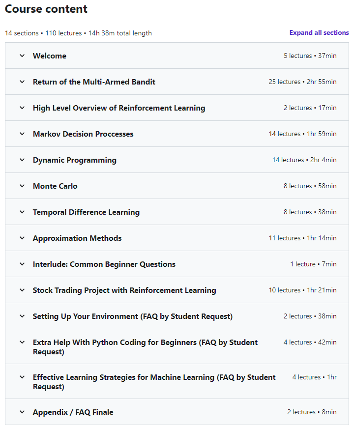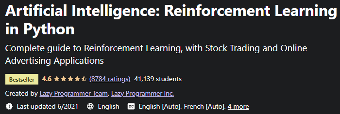 AI: Reinforcement Learning in Python,人工智能和强化学习(Reinforcement Learning)领域的数据和分析领域的培训视频系列的名称。在本培训中,您将熟悉人工智能和强化学习的概念,并在编程语言 Python 的帮助下完成。同样在这段时间里,视频你也将熟悉机器学习(machine learning)和深度学习(deep learning)等几个含义。当然,你作为一门综合性的课程是能够作为一个完整的指南来帮助你学习人工智能的。