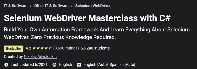 Selenium WebDriver Masterclass with C# 是一门入门且非常实用的课程,用于学习网络性能测试软件,最重要的是软件测试自动化框架。学习这门课程,你几乎不需要编程和软件测试领域的专业知识,C#编程语言的所有概念和概念都将在课程过程中提供给你。在本课程的帮助下,您将学习构建自己独特的测试框架和作为用户的框架,并使用 Selenium WebDriver 工具来测试各种应用程序。对于质量保证工程师来说,设计和构建各种软件测试可能是一项非常困难和复杂的挑战。构建一个简单的自动化测试可能需要用户花费很长时间,最终得不到想要的结果。