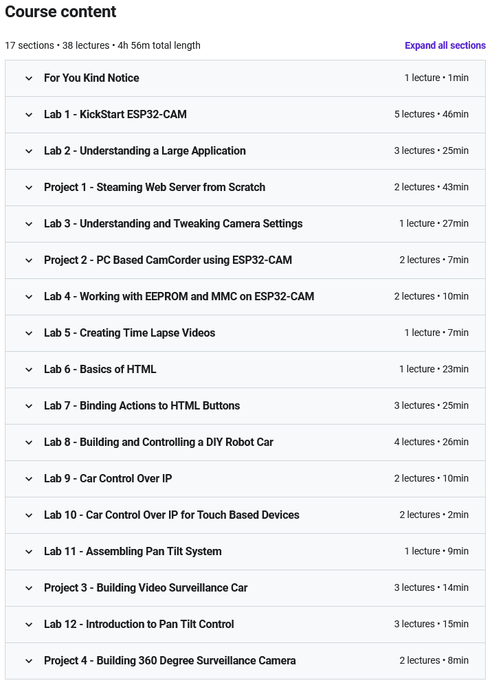 ESP32-CAM for Arduino Makers是御得米学院发布的针对ESP32-CAM硬件模块的项目化培训课程。在本培训课程中,您将以完全实用和项目导向的方式熟悉 ESP32 开发板,并在本课程结束时,您将使用 ESP32-CAM 模块构建一个视频处理机器人。 ESP32 是一套低成本、低成本的电子板,其主要应用在物联网领域和传感器提供的数据的解释。 ESP32-CAM 是一个功能强大的硬件模块,配备了一个简单的两百万像素摄像头,还包括蓝牙和 Wi-Fi 等各种通信设备。课程的教育过程完全以项目为导向,为了尽可能提高效率,您必须与讲师一起完成某些任务。