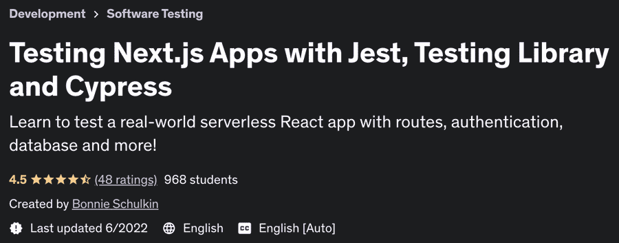 Testing Next.js Apps with Jest, Testing Library and Cypress 是由 Udemy Academy 发布的使用 Jest、Testing Library 和 Cypress 测试基于 Next.js 的应用程序的培训课程。本次培训课程完全项目化、实战化,在培训过程中使用了一个基于React框架的复杂应用,其中使用了路由、数据库与数据库、身份验证系统、用户访问级别管理等多种特性。你会慢慢工作。 Web 应用程序的测试是一个可靠的解决方案,可以防止项目最终启动后出现令人尴尬的错误和成本,并可以节省开发团队的时间和金钱。测试写作对程序员和开发人员来说是一项宝贵的技能,可以提升他们的简历。