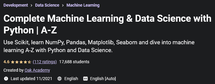 使用 Python 完成机器学习和数据科学 | AZ 是由 Udemy Academy 发布的 Python 编程语言的零到一百机器学习和数据科学课程。 Python 是一种高级多用途语言,可用于人工智能、机器学习、数据分析等各个领域。 Scikit、NumPy、Pandas、Matplotlib 和 Seaborn 等许多库都是基于 Python 编程语言开发的,每个库都用于数据分析和插图等各个领域。机器学习是一项新兴的革命性技术,我们已经在自动更正、预测文本和语音识别功能方面看到了简单实用的示例。这项技术日新月异,已经涉足电脑游戏、数字营销、编程等各个行业和平台。