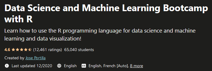Data Science and Machine Learning Bootcamp with R 站点的课程 Udemy 是如何在科学、数据、学习、机器和数据可视化展示中使用编程语言 R。求职科学家信息作为Glassdoor网站上最好的职位之一,据介绍其在一个国家如美国网站上的平均权利,确实超过12万美元。数据科学,一个职业,一个有价值又赚钱的职业,一定要让你解决世界上一些最酷的问题请。
