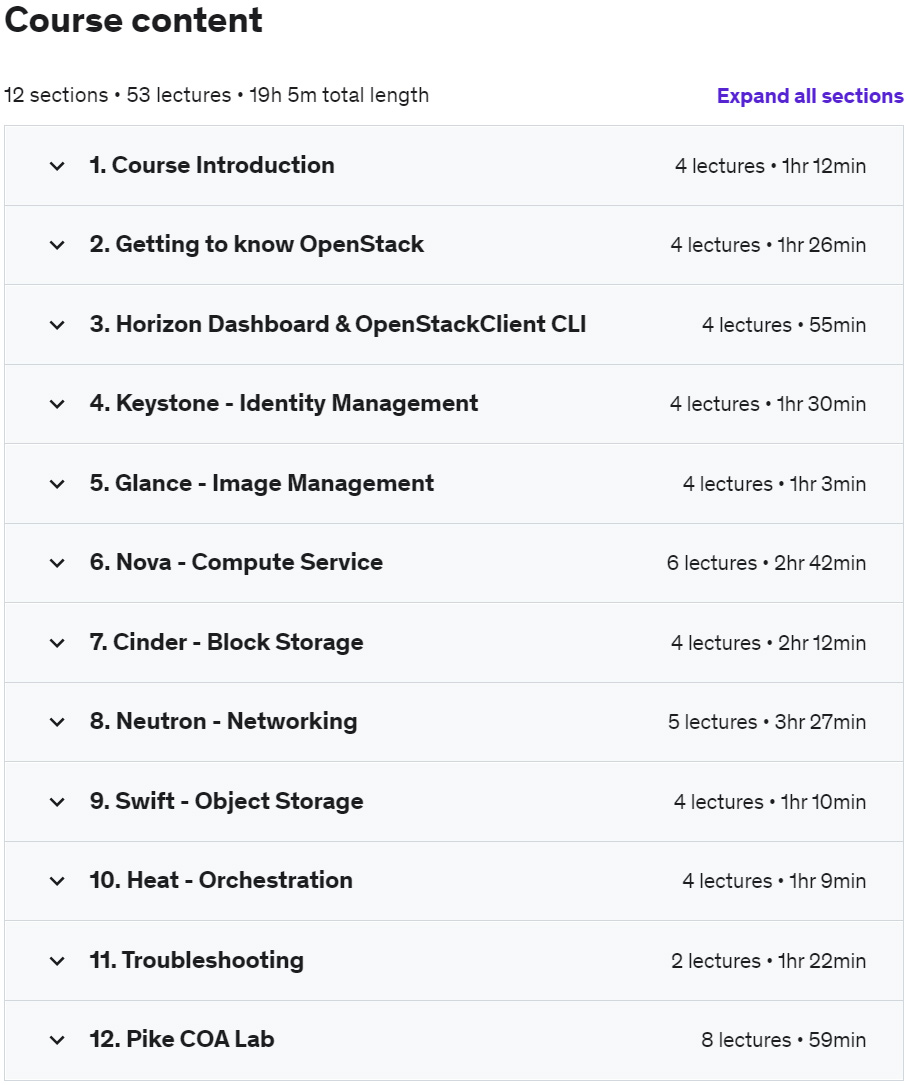 本课程很好地介绍了 OpenStack,涵盖了当前 COA(Stein 版)所需考试中列出的所有主题。但是,本课程基于之前版本的 COA 考试(2018 年)。为了获得学习 OpenStack 环境的最佳体验,如第 12 节中所述,其中包括 OpenStack Pike Release Lab 设置指南。在本课程结束时,您将精通常见的 OpenStack 管理任务,例如创建项目网络和路由器、设置虚拟服务器实例、在 OpenStack Cloud 中管理块和对象存储。