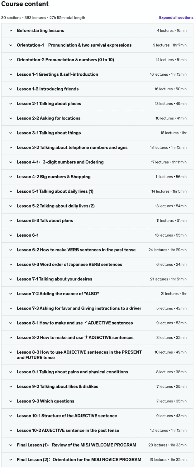 基于MISJ WELCOME PROGRAM的初学者日语是Udemy Academy出版的日语入门培训课程。本课程的培训课程是半私人的,学生应参与与讲师的对话以获得最佳结果,并以响亮和富有表现力的方式回答问题。本次培训课程基于MISJ入门培训课程设计,是Udemy最受欢迎的日语培训课程之一。从2018年首次发布到2021年最新更新,这门课程的分数从未低于4.5。本课程非常全面,包括许多主题,例如不同字母的发音和书写方式、高级词汇、实用术语等。