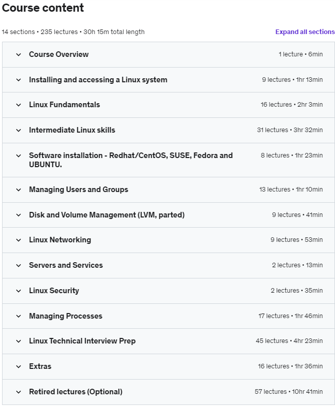 Learn Linux administration and Linux command line skills是Udemy Academy发布的Linux管理和Linux命令行技能培训课程的名称。完成本课程后,您将充分理解 Linux 服务器管理和 Linux 命令行最重要和最基本的概念。更重要的是,您将能够将这些概念应用到现实世界的实际情况中。您可以配置、维护和支持各种 Linux 系统。您甚至可以利用所学的技能成为一名 Linux 系统工程师或 Linux 系统管理员。与 Linux 相关的工作是 IT 行业薪酬最高的前 5 名工作之一。 Linux 是财富 500 强公司甚至初创公司的第一操作系统。如果您想开始您的 Linux 职业生涯并且对 Linux 知之甚少或一无所知,本课程可以为您提供帮助。在本课程中,您将学习 Linux 安装、配置、管理、故障排除、命令行、操作系统工具等等。此外,本课程还包括技术工作面试问题和答案,这一定会帮助你实现你的职业目标。还为您创建了测验来使用和测试您的知识。