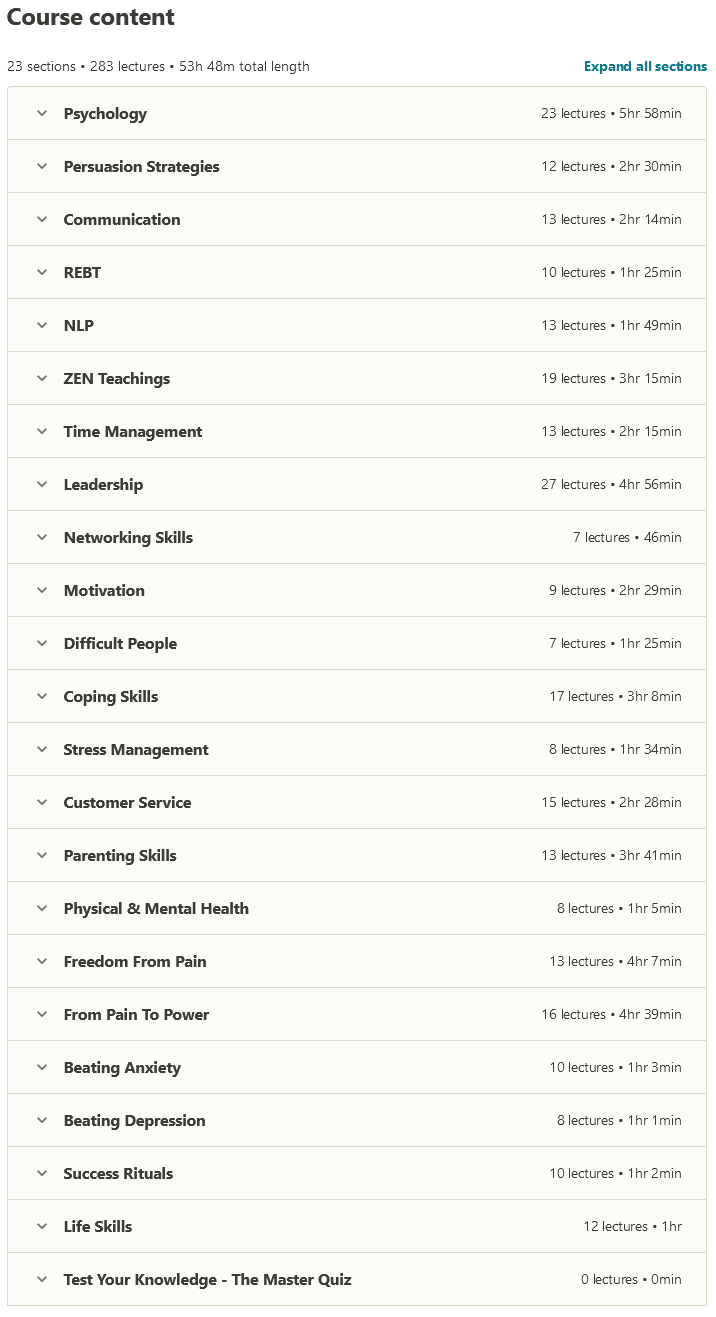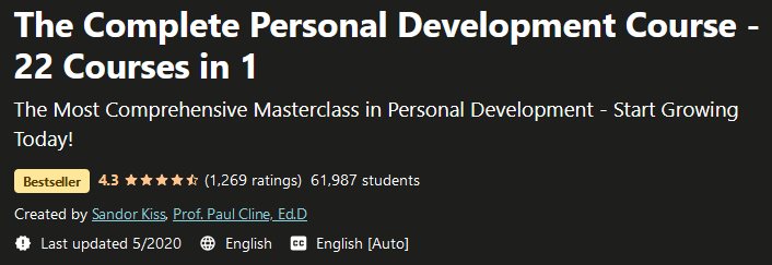 The Complete Personal Development Course – 22 Courses in 1,是一套全面的个人发展培训课程,包括22门不同的课程。该课程系列拥有超过 54 小时的教学视频和近 300 节培训课程,是个人发展领域规模最大的课程系列之一。