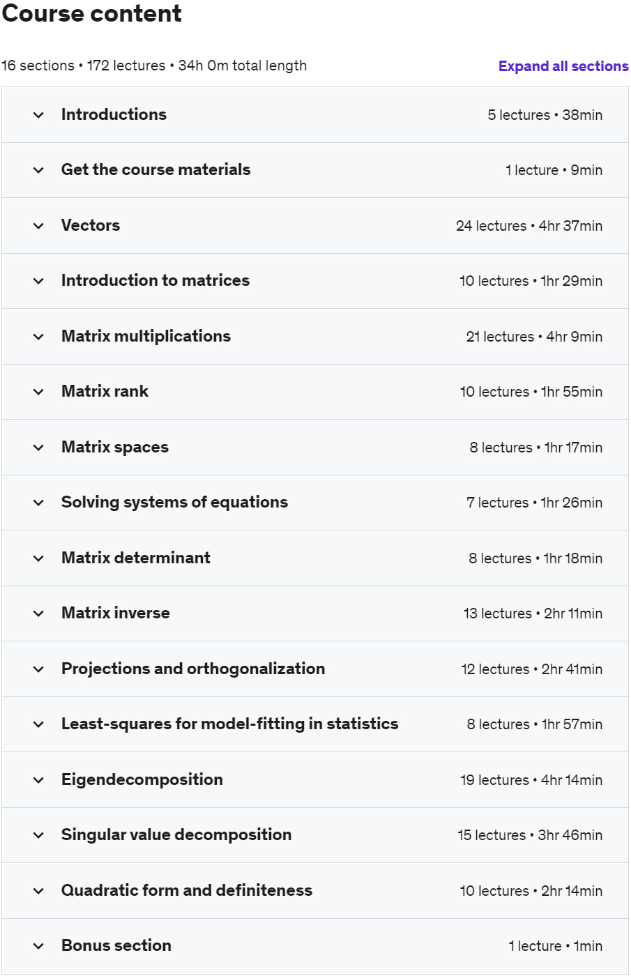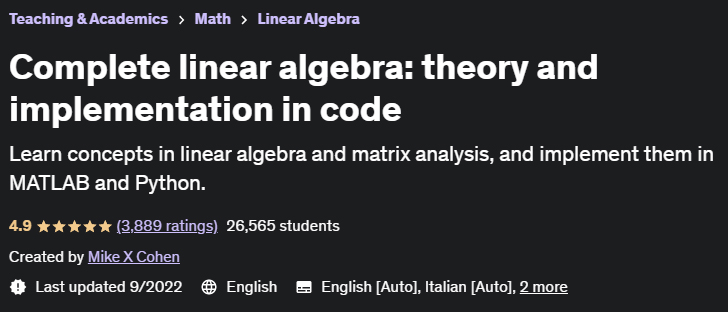 Complete linear algebra: theory and implementation a training course from the website Udemy is that the concepts of linear algebra and analysis matrix explained it and how to use it in Matlab and Python will teach you 给。线性代数是科学、计算中最重要的数学分支之一,例如机器学习、智能、人工、科学、数据、统计、模拟和……计算机图形学,分解矩阵是。教科书上讲解线性代数的方法与专家在计算机上使用它和求解程序的方法大相径庭,本课程力求为您提供这些方法,熟悉应用程序即可。
