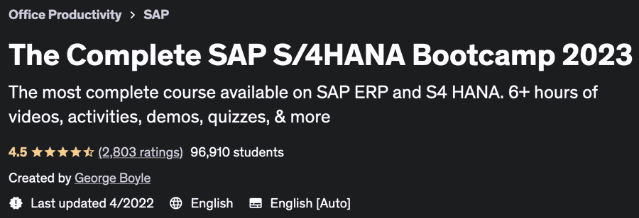 Complete SAP S/4HANA Bootcamp 2023 是 Udemy Academy 发布的针对 SAP ERP 和 S4 HANA 软件的完整培训课程。除视频文件外,该培训课程还包含一系列综合测试、测验、文本和 PDF 文件、演示和个人项目,是同类课程中最完整的已发布课程之一。 .大多数大型跨国企业和组织都使用 SAP ERP 平台来简化和精简他们的多个流程,并提高他们子集的绩效和生产力。该软件可以为您带来许多大公司的工作职位。