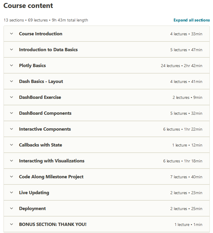 Interactive Python Dashboards with Plotly and Dash video tutorial on how to create designs and interactive dashboard smart with the use of the Plotly Python library Dash from the website Udemy is. This course will give you all the things to build a dashboard interactively using Python and the library, Plotly need, will train. After the end of each chapter a test will be presented to you up to chamois your new evaluated.