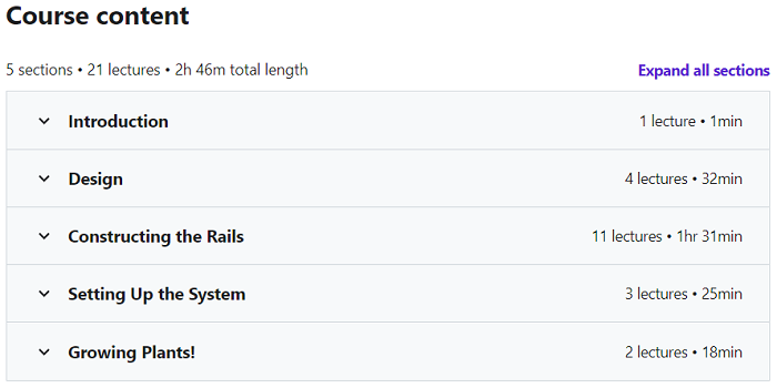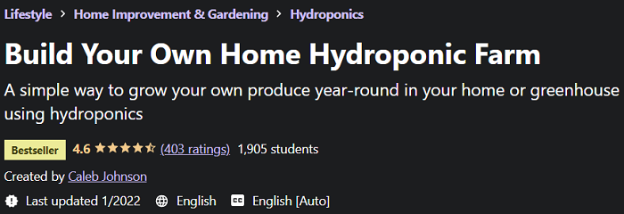 Build Your Own Home Hydroponic Farm 是 Udemy Academy 发布的关于建造家庭水培农场的视频教程的名称。本课程是关于如何构建水培系统以在您的家中或温室中种植作物的完整教程。本课程涵盖什么是水培的基础知识,解释了一些最常见的水培系统类型,并深入解释了它的工作原理、工作原理以及构建它所需的条件。本课程提供了您需要了解的关于建造和连接铁路系统、建造它所需的材料、创造种植区以及养分管理和种子种植的所有细节。您不需要任何以前的经验即可完成本课程。如果您担心开办家庭水培农场,但又真的想在家种植新鲜农产品,那么本课程适合您。您不需要以前的水培或建筑经验。本课程将指导您完成施工过程的每个步骤、每次切割、每个要钻的孔、每个连接,以及有关调整植物光照和养分的说明。