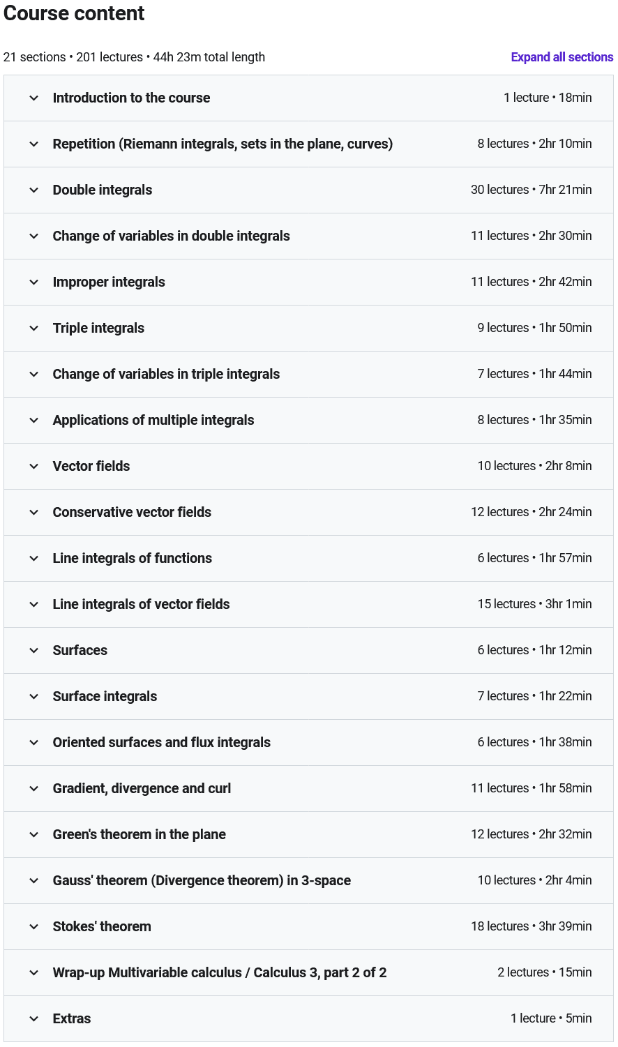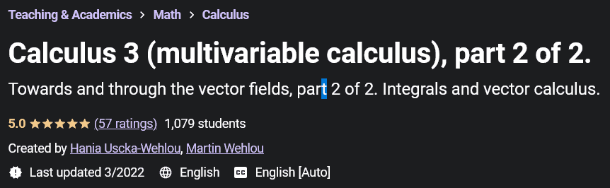 微积分 3(多元微积分),第 2 部分,共 2 部分。微积分 3 或 Udemy Academy 发布的多元微积分培训课程。在本培训课程中,表达了矢量领域的几个主题并学习了宝贵的技能。本课程是包含介绍性主题的非常庞大的两部分教育系列的第二部分。本课程的讲师使用了 Robert E. Adams 和 Christopher Essex 编写的《微积分:完整课程》一书,本课程中介绍的所有教育主题、技巧和主题与我的版本和这本有价值的书的第九版完全一致.