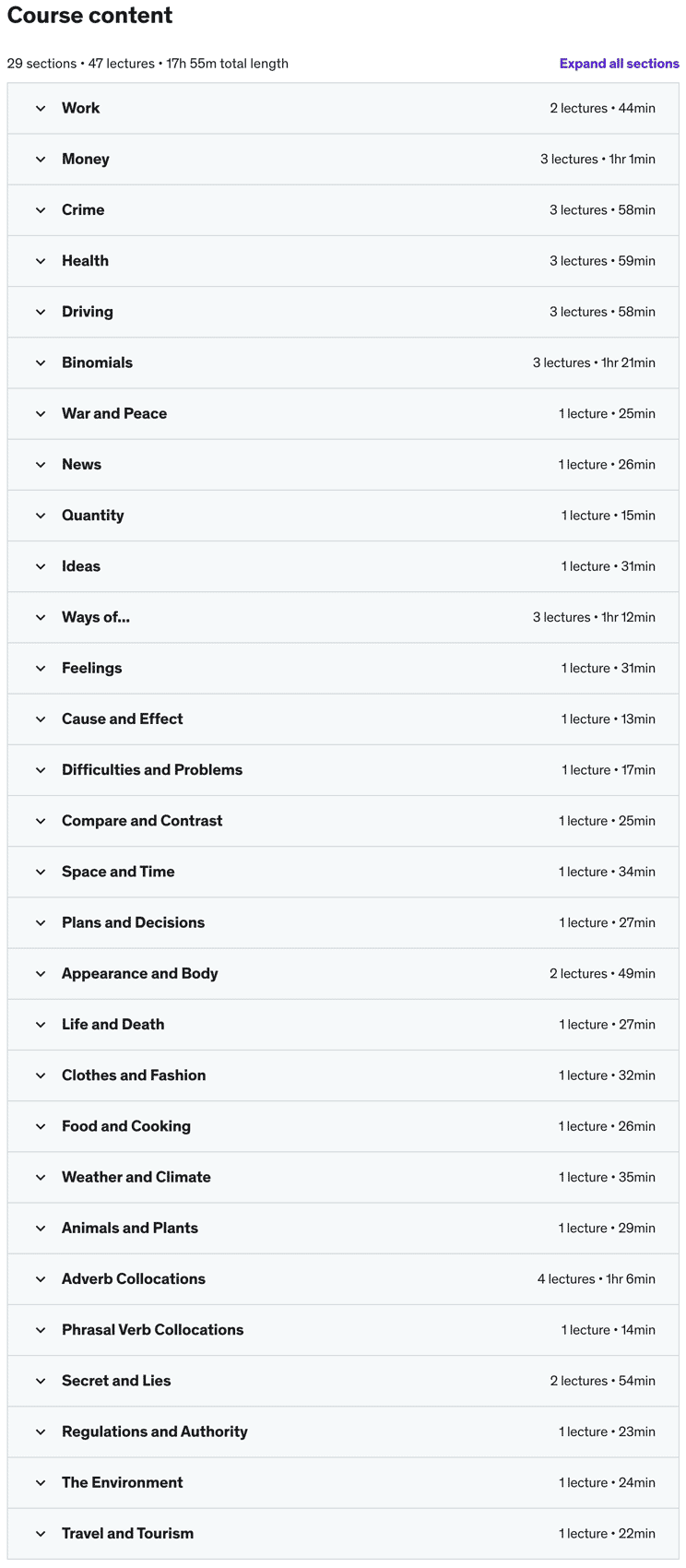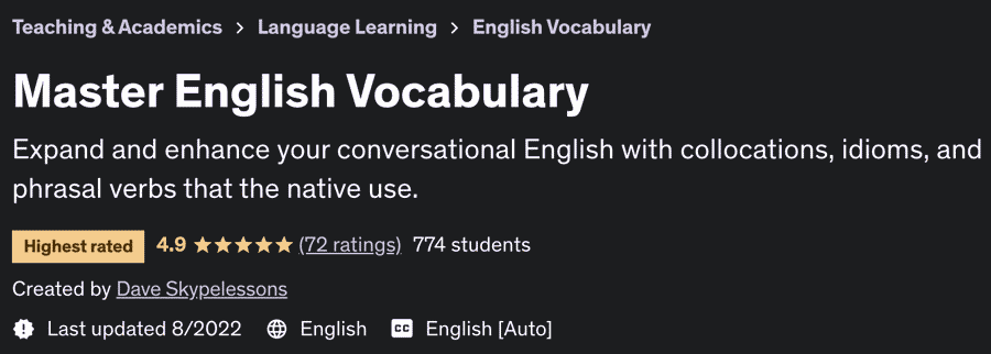 Master English Vocabulary是Udemy Academy推出的实用英语词汇培训课程。在本课程中,您将通过学习一组新的同音异义词、复合动词、成语和讽刺表达来扩展您的词汇量。学习这些单词将帮助您提高和扩展您的口语技能,并增加学习者说话时的自信心。本课程的学习过程一点也不肤浅,学习者在课程结束时将能够在他们独特的情况下使用不同的单词。