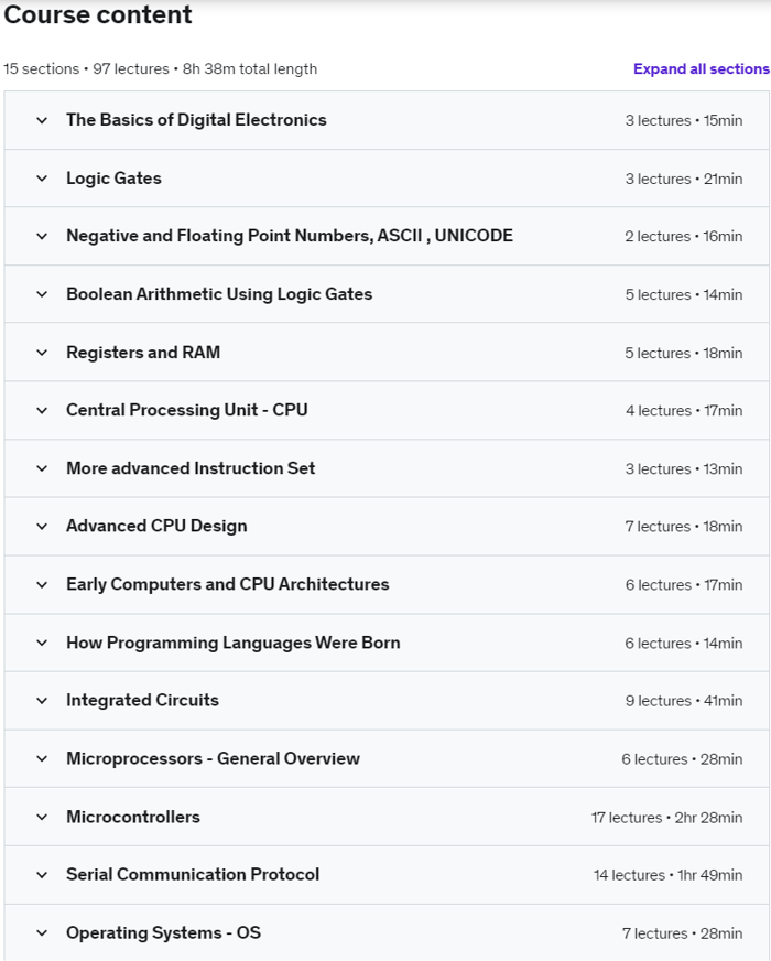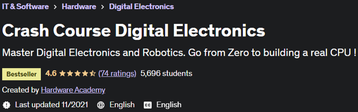 Crash Course Digital Electronics 是 Udemy Academy 发布的数字电子和机器人技术培训课程的名称。本课程不仅旨在教您数字电子产品的基本部分是如何工作的,而且还解释了我们是如何制造出如此神奇的东西的。我们从 1839 年回到 Jacquard 机器,它被认为是第一台使用穿孔卡编程的可编程机械计算机,回到现代编译器、编程语言、微处理器、微控制器和操作系统。我懂了。所有教程均使用动画技术制作,以说明概念并便于理解。完成一章后,您将收到一份调查问卷,其中包含一堆问题(包括图片和图表)供您回答。如果你做对了,你就可以确定你理解了我在那一章要说的内容。