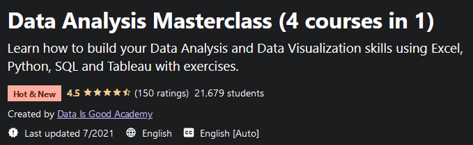 Data Analysis Masterclass (4 courses in 1)是一门使用Excel、Python、SQL和Tableau进行数据可视化和数据分析技能的培训课程,并带有实践练习。数据分析涉及审计、提炼、转换和建模数据以发现有用信息、公布结果和支持决策的过程。本课程为您提供 Excel、Python 和 SQL 的基础知识和高级知识。