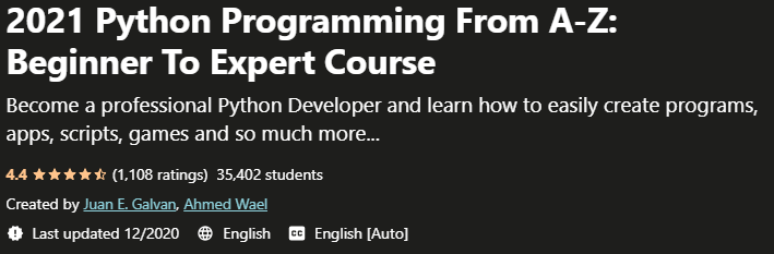 2021 年 AZ Python 编程:初学者到专家课程,学习 Python 成为专业开发人员并学习如何构建方便的应用程序、游戏、脚本和……行业的时期的名称。构建本课程的主要目的,你不仅在了解python中的输入和输出方面的知识对你有帮助可能,而且会帮助你了解软件开发行业,在现实中,它是如何工作的以及还有哪些区别在团队中的角色与如何找到一份 Python 编程工作之间,没有学位可以教你。