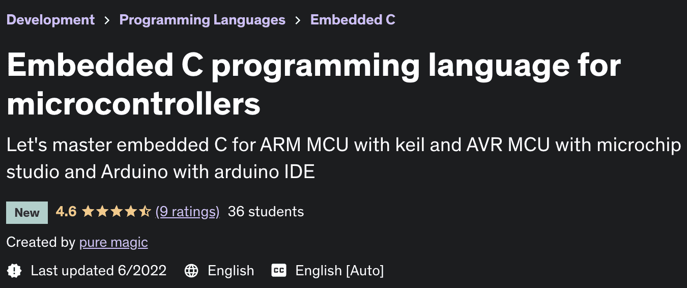 Embedded C programming language for microcontrollers是Udemy Academy出版的微控制器Embedded C编程语言培训课程。本培训课程完全以项目为导向,在此过程中您将使用嵌入式C语言对各种处理器和微控制器进行编程,例如ARM MCU、AVR MCU和Arduino。为了创造多样性,您还将受益于各种开发环境和软件,例如 keil、microchip studio 和 arduino IDE,它们各自具有独特的功能和工具。在完成基本主题和对微控制器类型和嵌入式 C 语言语法的简要介绍后,您将进入故障排除和调试领域,并扩展您的开发和编程技能。