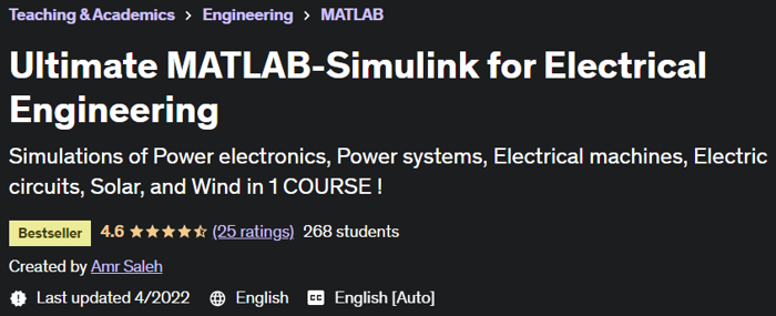 Ultimate MATLAB-Simulink for Electrical Engineering 是 Udemy Academy 出版的电气工程综合 MATLAB 和 Simulink 培训课程的名称。在本课程中,您将掌握与电力电子、电力系统、电机、电路、风能和太阳能相关主题的仿真。