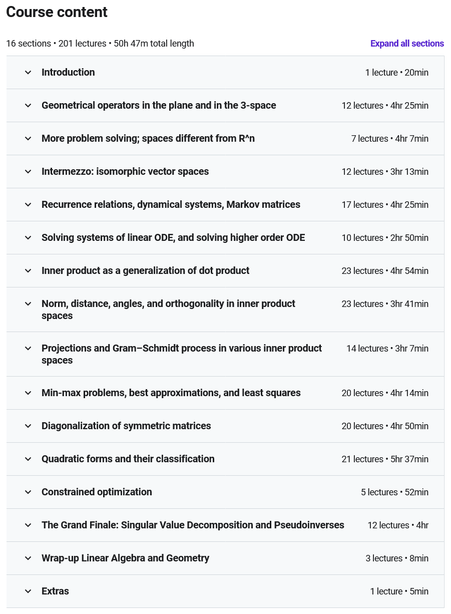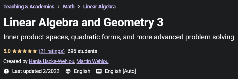 Linear Algebra and Geometry 3 是 Udemy Academy 出版的线性几何和代数培训系列的第三部分。本节还包括前面四个部分,分别是本征分解和谱分析、内积空间、对称矩阵和形式。它是方形的。 (二级图)。培训课程的课程是综合性的主题和实践,在课程过程中面临超过144个代数和几何领域的问题和挑战。在每个视频的结尾,您将看到一个有目的的练习。这些练习中的每一个都有一个完全直观的分步解决方案文件,用于检查和分析解决问题的不同方法。