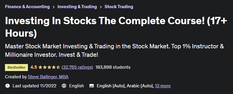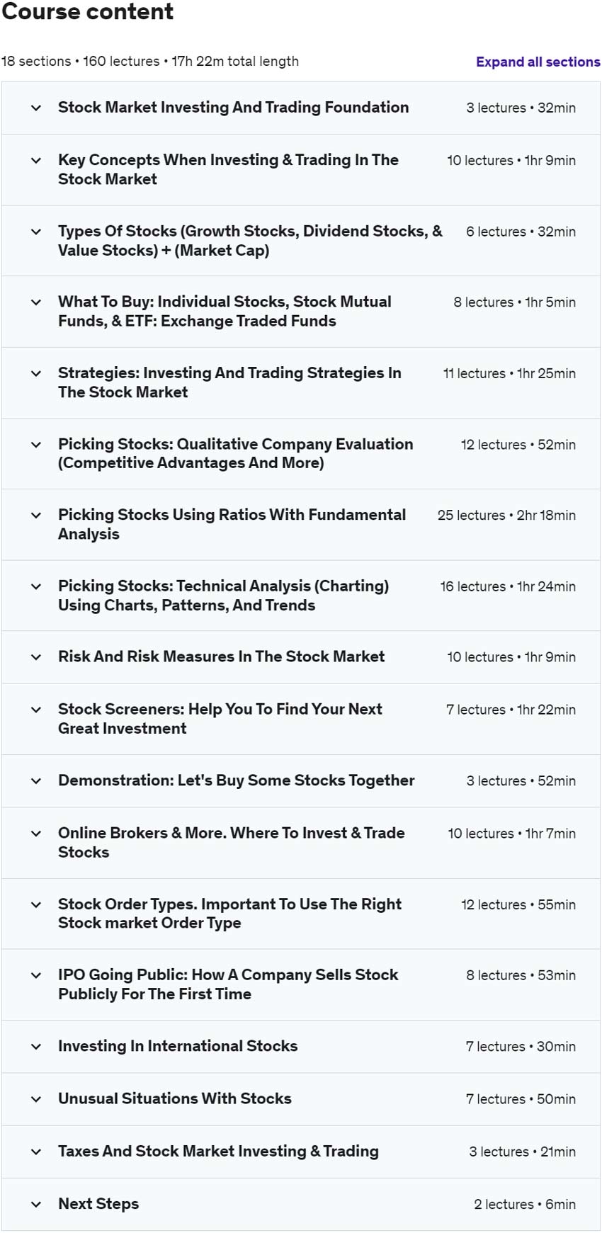 投资股票的完整课程! (17 小时以上)是 Udemy 网站上的一门课程,向您介绍股票交易并教授共同基金、ETF 等知识。任何对投资感兴趣的人都可以成为股票市场的专业人士,并通过学习关键概念和进行正确的练习来实现他们的财务和梦想生活目标。但是,许多人在没有学习适当的培训信息和熟悉必要的技术的情况下进行投资,并以失败换取成功之路。