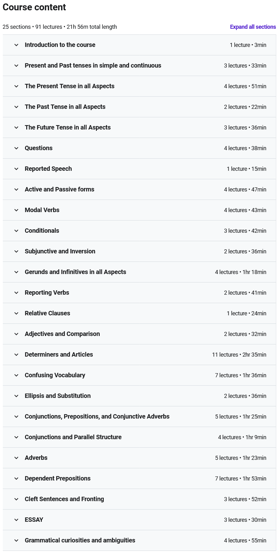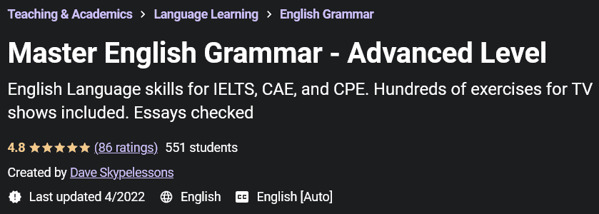 Master English Grammar – Advanced Level是Udemy Academy推出的高级专业英语语法培训课程。本次培训课程涉及的话题和话题具有通用性,托福、雅思、CPE等的申请者同样可以从中受益。本培训课程完全实用,每个视频和培训主题的帖子都将向用户提供一组练习和有目的的问题。本课程最重要的主题包括语法时态、动名词、情态动词、虚拟语气、倒装、介词和后置词。 、连词、限定词、报告动词、分句、比较等。