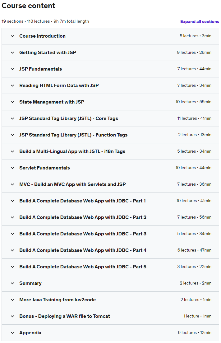 本教程包括 9 小时的入门培训,适合那些有兴趣基于 JSP/Servlet 构建数据库的人。在本课程中,您将有 116 节课。在本课程结束时,您将能够设计和运行一个完全高效的数据库。本课程适合初学者和对该领域感兴趣的任何人。该视频教程将对您的学习非常有用。