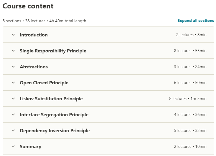 SOLID 的原理包含了 40 多年的科学研究和工业经验。总之,通过掌握 SOLID 原理方面的技能,您拥有了所有的工具,并且随着时间的推移经过验证,可以为用户提供高质量的软件。在本课程中,您将了解 SOLID 的原理,了解它们的重要性。您将看到这些原则将如何帮助您编写具有灵活可扩展性和可读性的代码。