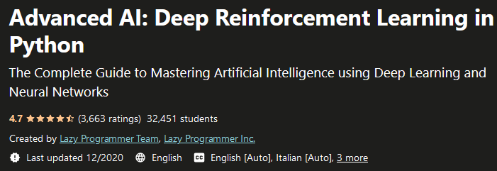 Advanced AI Deep Reinforcement Learning in Python,数据和分析领域的培训视频系列名称,分支,编程语言,Python均可。本课程专门教授高级人工智能重点。你要借助 Python 编程语言,并且熟悉深度学习这门科学,才能大显身手,你想打。当然,你作为深度学习以及神经网络的综合课程是很有期待的。本课程将作为您大幅提升的有效技能的一个阶段。