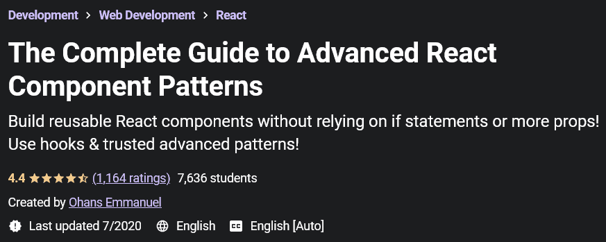 The Complete Guide to Advanced React Component Patterns是由Udemy Academy出版的关于React开发模式和可复用组件制作的培训课程。在本培训课程中,您将熟悉 React 的钩子和高级开发模式。有了hooks,就不需要使用条件命令和props来构建组件,可以更高效地构建组件。你可以很容易地从 Ray 程序员那里开发一个网站,但是他们中很少有人能够优化组件并构建具有可重用性的组件。本课程是一个完全社交和实践的项目,与课程导师一起开发了一个类似于Medium网站的应用程序。