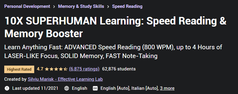 10X SUPERHUMAN Learning: Speed Reading & Memory Booster 是一系列关于记忆和阅读技巧以及阅读和记忆快速内容主题的视觉训练的名称。事实上,您将在本课程中学到的技能和技巧将使您的阅读和学习速度提高 10 倍,并且更加有效。事实上,您将通过学习如何提高记忆力来提高个人技能,从而节省学习更多的时间。