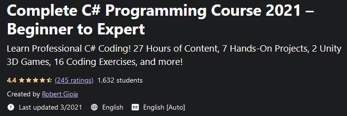 Complete C# Programming Course 2021 – Beginner to Expert,是一门专业的C#编程语言培训课程,其中提供了7个不同的项目、2个3D Unity游戏和16个编码练习。本课程的目的是为那些没有该领域先验知识并希望使用 C# 编程语言进行游戏开发的人做准备。
