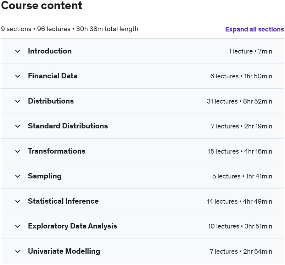 通过这门基础统计和金融与商业应用课程,提高您的金融职业统计技能。统计学是为所有金融领域提供分析基础的主要学科。本课程由经验丰富的金融专家和前数学教授设计和制作,使您处于全球金融行业使用的领先定量技术的最前沿。本课程假定您没有统计学或金融知识。本课程将使您从高中数学基础发展到金融市场建模、金融产品分析和风险管理的定量和计算工具的前沿。本课程提供统计概率基础知识的全面背景知识。对统计、估计、假设检验和置信区间的主要主题进行了深入探讨。现代统计方法用于解决实际的财务问题。