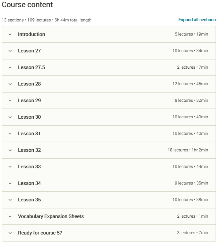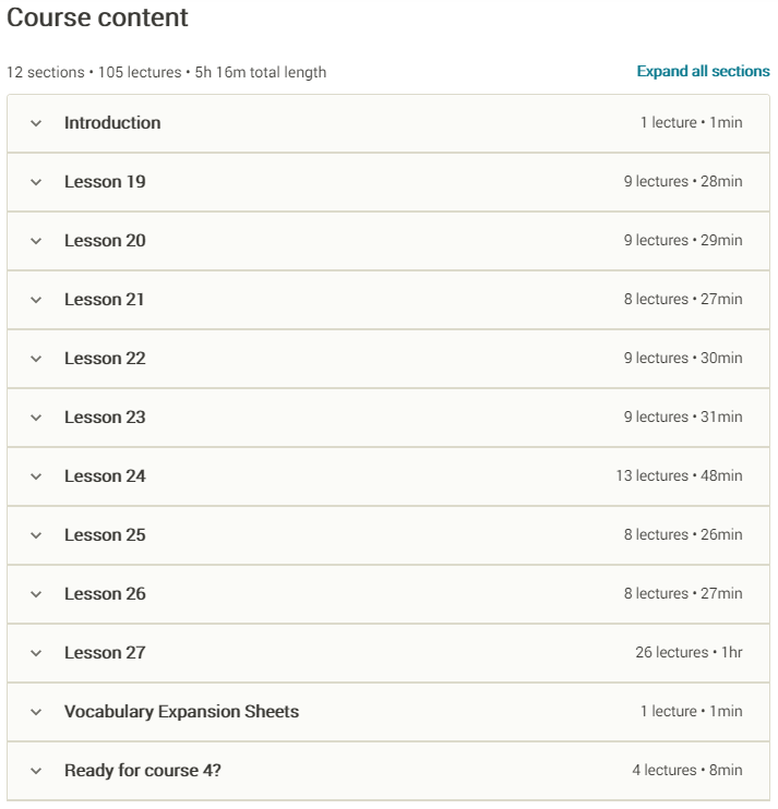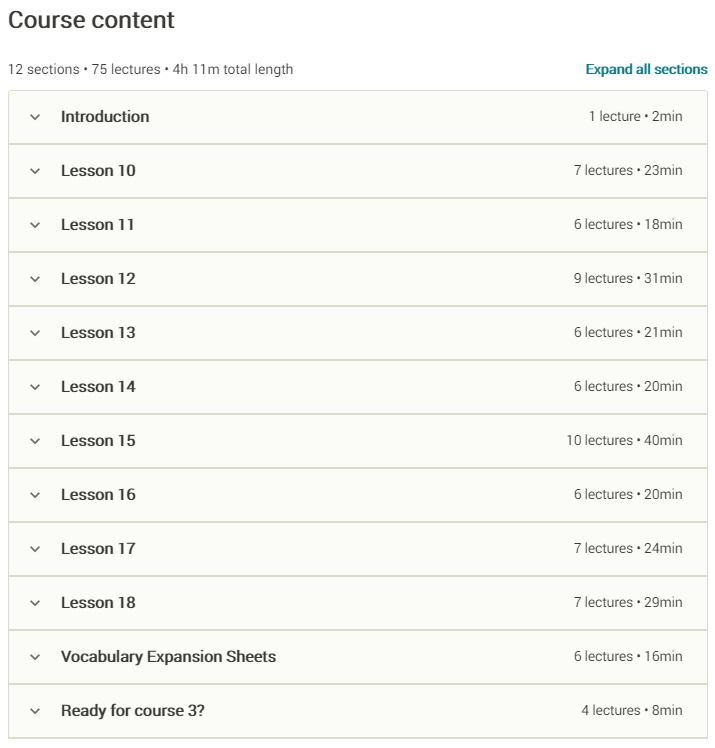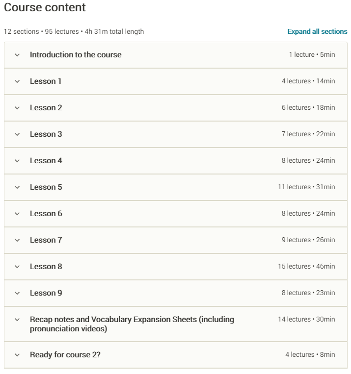 该系列分为 7 个部分。第一部分会让你熟悉这门语言的结构,为你形成一个基本的词汇圈。解释事物或点菜等普通句子是您将在本节中学习的内容。然后在第二部分,你会熟悉一些新话题,比如报时或打车。您还将学习动词的使用。 Part III 还可能需要询问几个不同的术语——Have deals;第四部分涉及解释过去的事件和向别人介绍自己等等,在第5节和第6节和第7节中,你用单词、结构等、措辞等、语法规则和训练多样化和你可以结识新朋友。