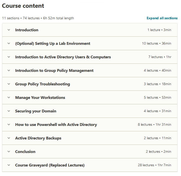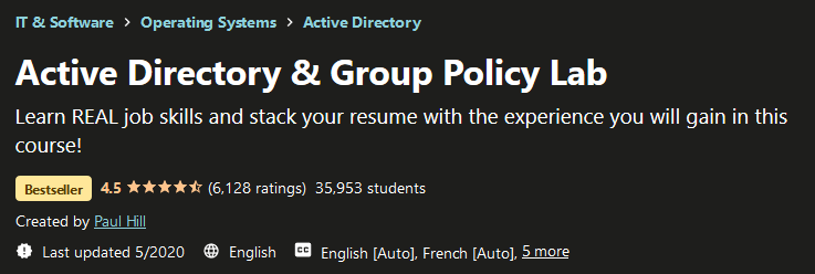 Active Directory & Group Policy Lab 是一个 Udemy 网站培训课程,全面教授您 Active Directory 和 Windows Server 策略组主题。您可以使用本基于实际场景提供的教程来提升您的工作技能,让您的简历硕果累累。本课程旨在提供提升职业水平和找到高收入工作所需的技能。本课程中讨论的主题侧重于 Active Directory 和策略组。目标是让你在最短的时间内学到最多的东西。