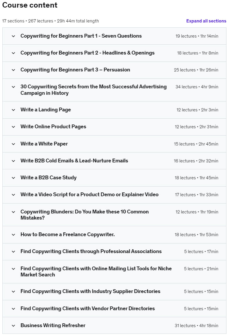 - 学习如何撰写当今最热门的文案写作任务,从白皮书到登陆页面,从谷歌广告到电子商务页面,从广告牌到电子邮件。
