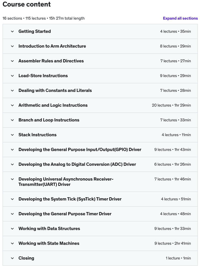 ARM GNU Assembly Programming From Ground Up™ 是由 Udemy Academy 发布的有关 ARM 处理器的汇编编程和 GNU 操作系统 (GNU) 的培训课程。本培训课程包含一系列分散但重要的主题,其中最重要的是模数转换器 (ADC)、通用异步串行发送器和接收器。或UART、GPTM、SYSTICK单元、FIFO、有限状态机、外设驱动开发与编程、算法编写等。本次培训课程将针对GNU汇编器编写程序和汇编代码,在这方面,用户可以轻松使用不同的操作系统,例如 Windows、Mac OS 和 Linux。