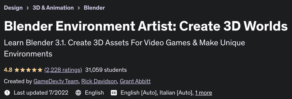 Blender Environment Artist:Create 3D Worlds 是一门关于使用 Blender 软件创建 3D 环境和想象世界的培训课程,由 Udemy Academy 发布。本次培训课程设计的环境和世界是完全三维的,可用于电脑游戏或动画的开发。在本课程的教学过程中,您将使用 Blender 软件 3.1 版。本培训课程不需要任何 3D 建模和其他设计工具领域的背景知识,讲师将从最基本的部分开始,即解释工具和 Blender 用户界面。