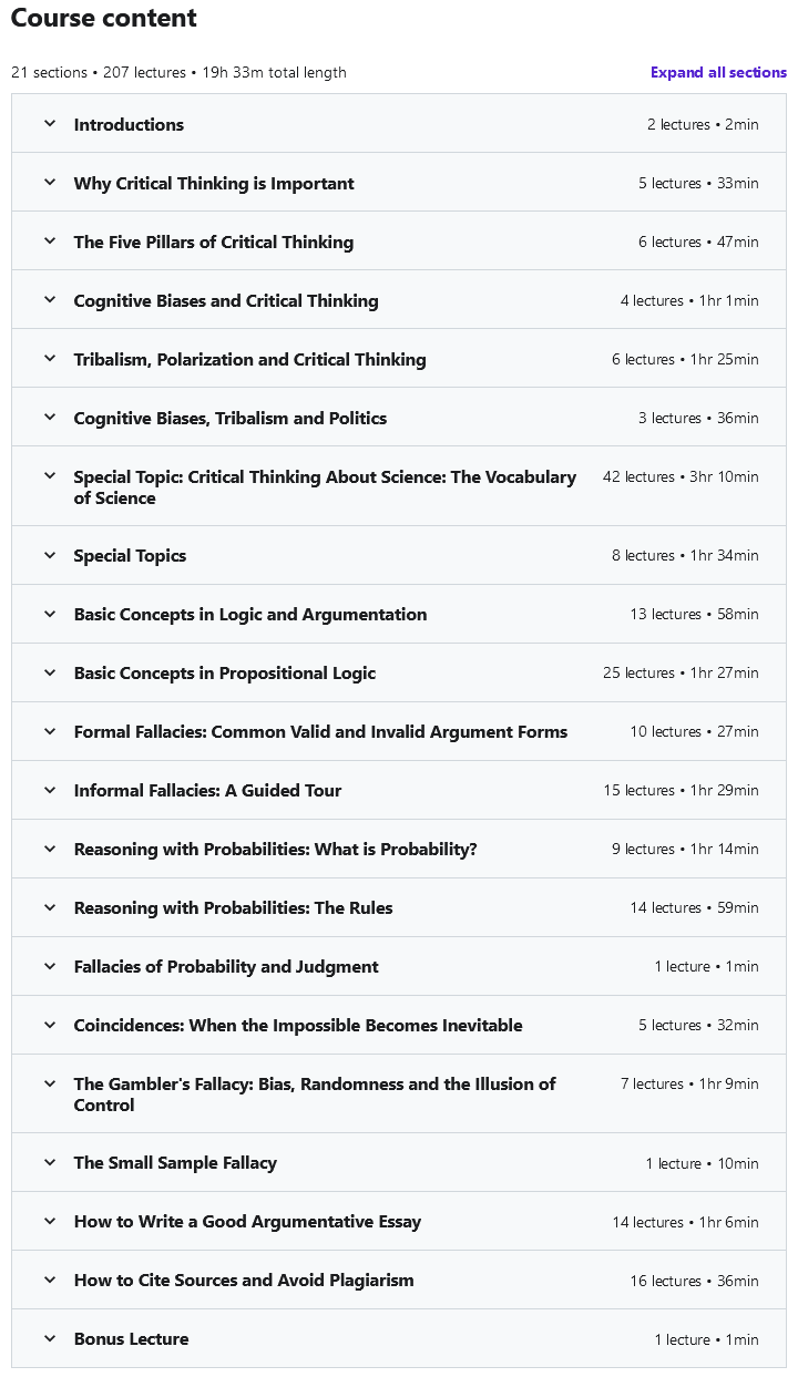 批判性思维学院:学会像哲学家一样思考是一门批判性思维培训课程。在本课程的帮助下,您可以提高成绩,在工作中取得进步并扩展您的理解。为了在学校、学校、企业和生活中取得长期成功,学习如何思考比你的想法更重要。作为理性的人,我们将逻辑、推理分析和批判性推理的教学限制在特定大学的课程中,这些课程在很晚的时候对有限数量的学生有用。在本课程中,您将了解批判性思维的重要性、逻辑和推理之间的区别、好的推理和坏的推理、批判性思维中背景知识的重要性等等。
