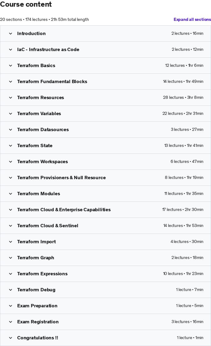 欢迎来到这个关于 HashiCorp 认证的精彩课程:Terraform Associate -50 实践演示。以下是本课程涵盖的模块列表。