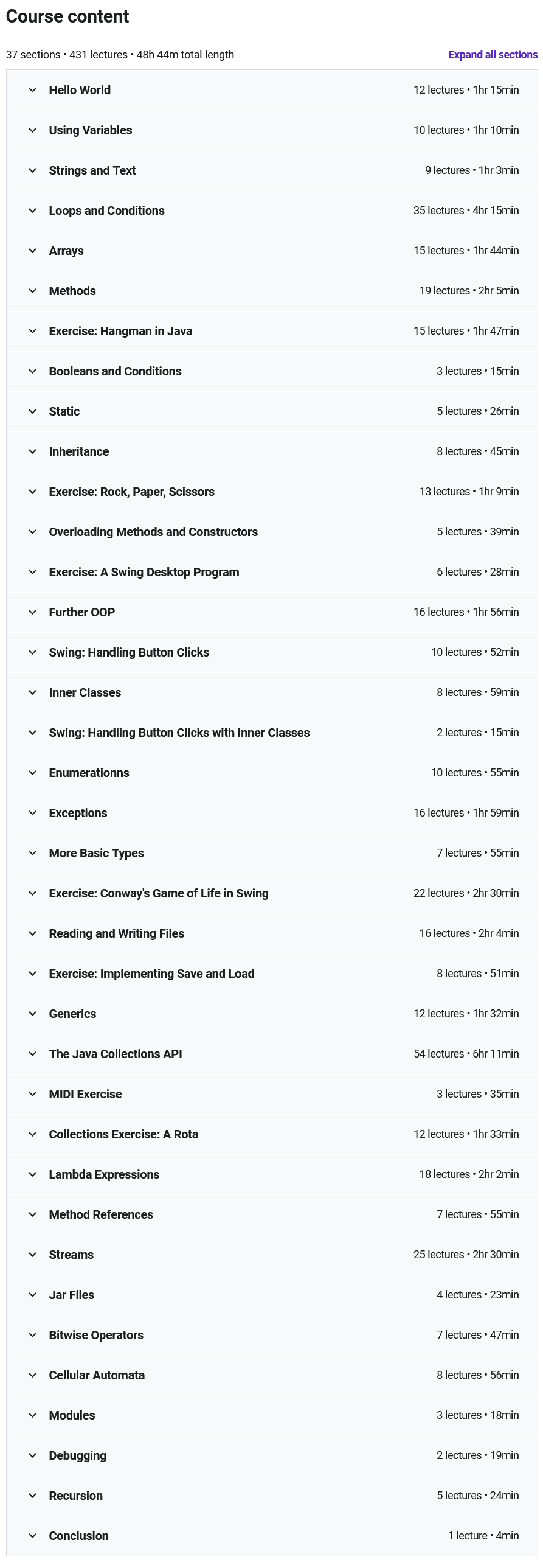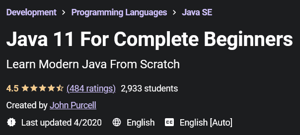 Java 11 For Complete Beginners 是 Udemy Academy 发布的 Java 编程语言入门课程。本培训课程将从零点开始,完全介绍编程和计算机科学的主题,并以完全有原则的方式形成您的科学基础。综合课程的教学过程以实践和项目为导向,本课程将使用Java编程语言11和12版本。版本 11 和 12 是两个经过良好解释的专业版本,被广泛的 Java 程序员使用。