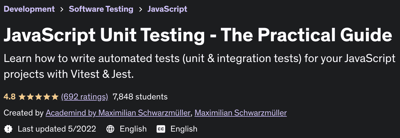 JavaScript Unit Testing – The Practical Guide 是 Udemy Academy 发布的 JavaScript 单元测试实践类项目导向培训课程。创建各种自动化和自动化测试,包括单元测试和一次性测试,在开发和编程过程中非常重要,可以增加您对该主题的掌握程度。在本培训课程中,您将使用两种在测试 JavaScript 程序领域中流行的工具,Vitest 和 Jest。自动化和自动化测试是一个相对较新的概念,同时在网络开发和编程领域非常重要。这个领域一开始似乎有点挑战,但学习和掌握它的概念会对你的其他技能和发展洞察力产生巨大影响。