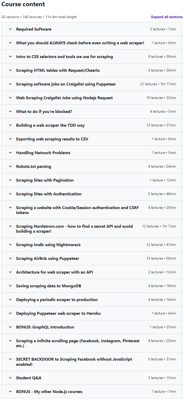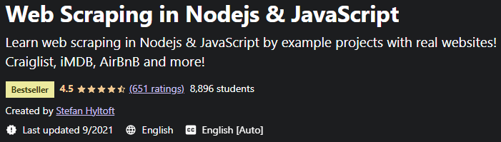 Web Scraping in Nodejs & JavaScript 是一个面向项目的网络抓取培训课程,使用 Nodejs 和 JavaScript 以及 Craiglist、iMDB、AirBnB 等真实网站。在本课程中,您将学习如何在 JavaScript Nodejs Request、Cheerio、NightmareJs 和 Puppeteer 的帮助下,使用实际示例和真实站点来抓取网站。