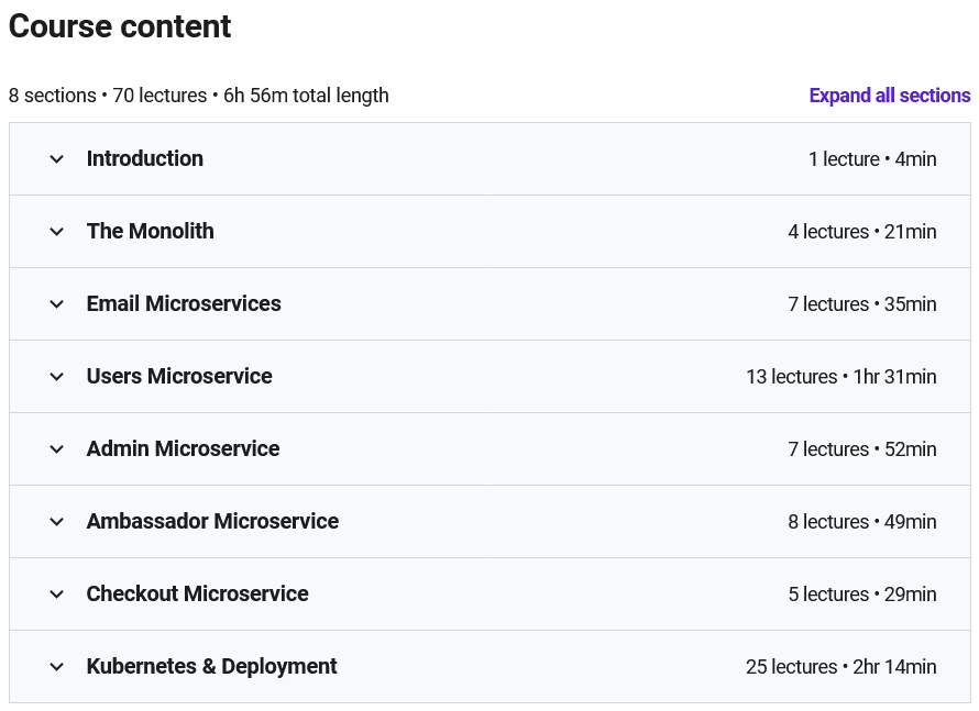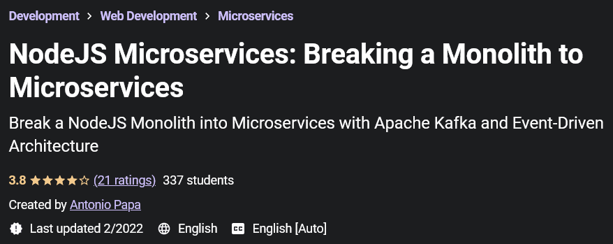 NodeJS Microservices: Breaking a Monolith to Microservices是Udemy Academy发布的一门基于Node.js应用的应用开发培训课程。本培训课程完全面向项目,您将基于 Monolith 架构将现成的应用程序重写为完全独立且有原则的微服务。将单体应用程序转换为多个微服务的过程称为单体故障或单体故障到微服务。为此,您将使用 Apache Kafka 平台和事件驱动架构。微服务的概念和各种软件开发模型是一个高级和现代的话题,希望学生在开始本课程之前加强他们在 JavaScript 编程领域的背景知识。