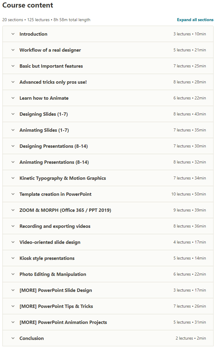 PowerPoint 大师班 – 演示文稿设计和动画是一门培训课程,涵盖您在 PowerPoint 中创建专业演示幻灯片、动画和视频所需的一切知识。本课程让您准备好使用成为 PowerPoint 大师所需的所有工具、知识和技能,您将成为更有能力和更全面的设计师。本课程分为6章。在这些章节中,您将熟悉 PowerPoint 的基本主题和动态、幻灯片和动画设计、视频制作和 PowerPoint 模板。