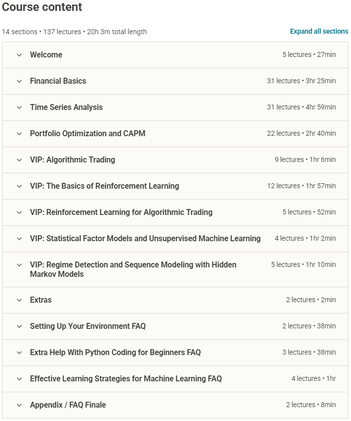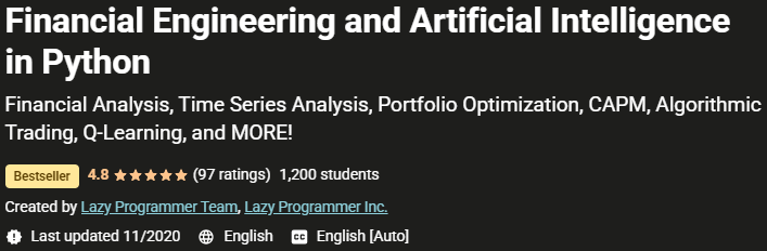 懒人程序员开发的金融工程与人工智能Python课程,将教你如何在人工智能和金融领域使用Python编程语言。本课程由 14 个部分组成,完成本课程及其所有部分的领域,例如股票价格预测和股票收益、时间序列分析、Holt-Winters 平滑模型、综合相关移动平均线、有效市场假设您将掌握随机游走假设、探索性数据分析、alpha 和 beta、股票收益的分布和相关性、均方差优化、资本资产定价模型等。