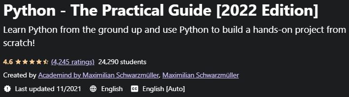 Python – The Practical Guide 是流行且功能强大的 Python 功能培训和实践驱动的编程语言的名称。如今,python在编程语言中的趋势最为明显。易用性、Syntax 简单易学、用户超高、能够在不同平台上运行和用于机器学习等优点都是影响这门编程语言流行的因素,所以他们两人。该语言被谷歌和亚马逊等著名公司使用,许多网络和桌面应用程序都是在 Python 的帮助下开发的。如果你想进入编程专业,学习编程,专业高效,语言简单但功能强大,应用广泛,需要具备Python等这两个特点。