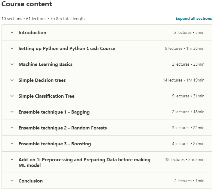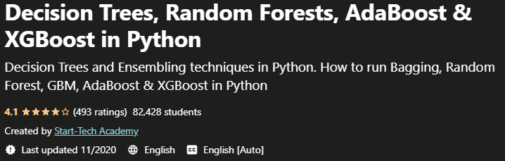 Python 中的决策树、随机森林、AdaBoost 和 XGBoost,Udemy 上使用 Python 语言学习决策树的培训课程的名称是。课程结束后,您将在机器学习集中使用决策树/随机森林/XGBoost 时遇到业务问题,正确理解高级决策树,如 Random Forest、Bagging、AdaBoost 和 XGBoost头脑。另外,你想在 python 中有一个决策树模型,对它进行分析,最后,通过本课程,你将能够理解机器学习的概念,他们将进行实践,并且还将讨论这些概念.