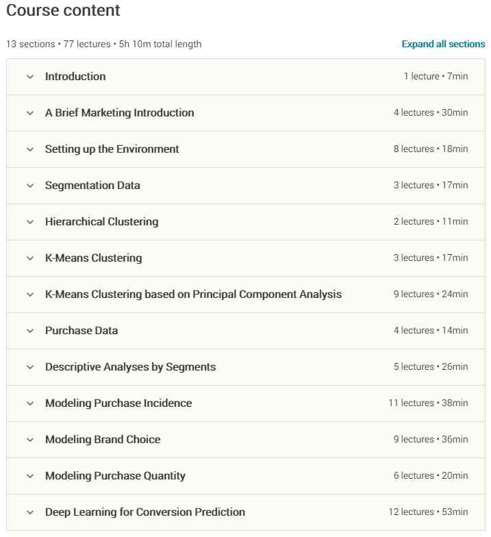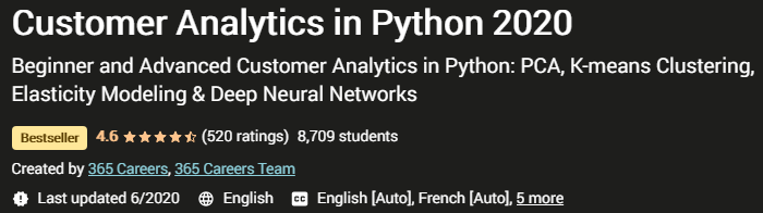 Customer Analytics in Python 2020 是使用 PCA 方法、K-均值聚类、反动建模和深度神经网络的 Python 综合客户分析培训课程。在经济、现代科学、数据和市场营销中,想要将自己定位在顶端、保留和分析客户的公司的关键正是这两种力量的结合所在。本课程伴随着广泛的数据科学知识和公司在 Python 培训中使用和实施的令人兴奋的方法。掌握了这些知识和技能,对于就业机会收入高,在科学数据领域,也有变化和转型,很多公司的营销部门为了利用这些知识可以是非常有利的。