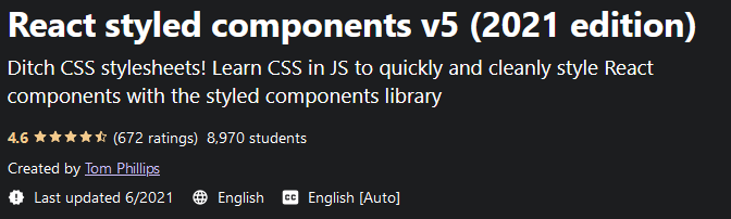 React styled components 是一个 Ditch CSS 样式表培训课程,它将快速教您如何在 JS 中使用 CSS 以及如何设置 React 组件的样式。 styled-components 课程是响应式开发人员想要提升其作为前端开发人员的价值的下一步。 styled-components 框架允许您在 JavaScript 代码中编写 CSS 代码,这意味着您可以使用您想要的所有 CSS 功能(包括媒体查询、伪选择器、嵌套等)。