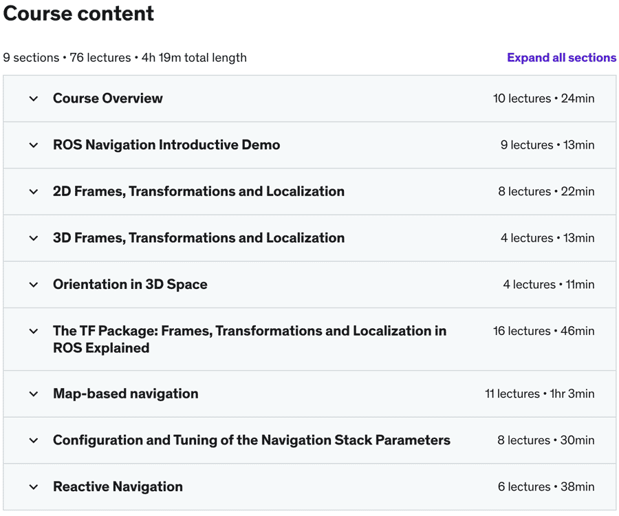 ROS for Beginners II: Localization, Navigation and SLAM是由Udemy Academy出版的一门关于使用ROS在各类移动机器人中同步定位和建图(SLAM)和机器人导航的培训课程。检查路径中的定位、映射、路由和移动是机器人设计和开发中最重要的主题之一。这些主题本身就非常复杂,当它们相互作用时会变得更加复杂。常规的和老旧的课程为学生提供了这两个领域非常好的理论信息,但是他们所提供的信息没有一个是实用的和适用的,实际上并不能把机器人领域的工程师带到任何地方。使用 ROS 工具集和库实现路由功能是一项非常艰巨的任务,需要实践。